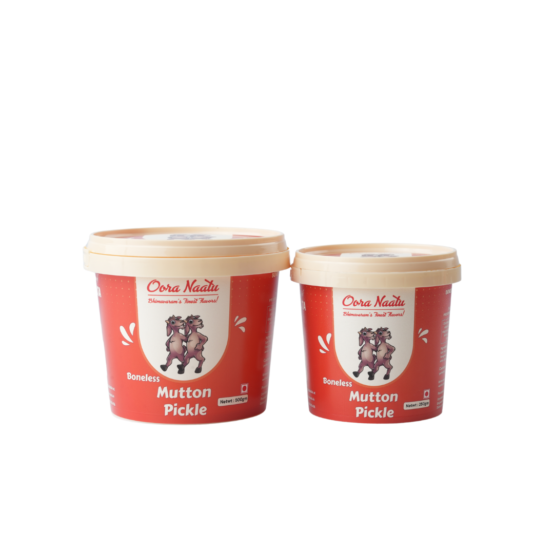 Relish the bold, meaty richness of Andhra’s culinary heritage with Oora Naatu Boneless Mutton Pickle – a spicy, slow-cooked delicacy made with tender mutton chunks and a signature blend of traditional spices. Each bite delivers a fiery, flavorful punch, perfected with the tang of tamarind, the aroma of garlic, and the warmth of roasted fenugreek.